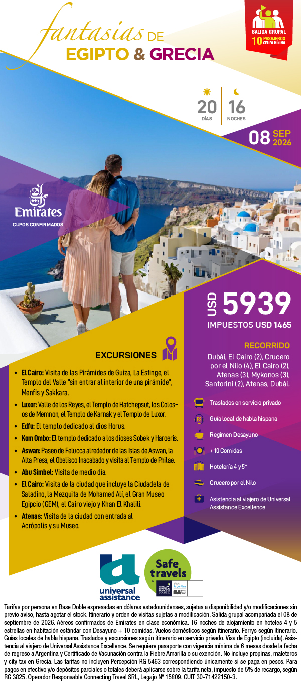 Equipaje permitido: Incluye 2 equipajes en bodega 23 Kg y equipaje de mano 8 Kg con Emirates / 1 equipaje en bodega 23 Kg y equipaje de mano 8 Kg con Aegean.
